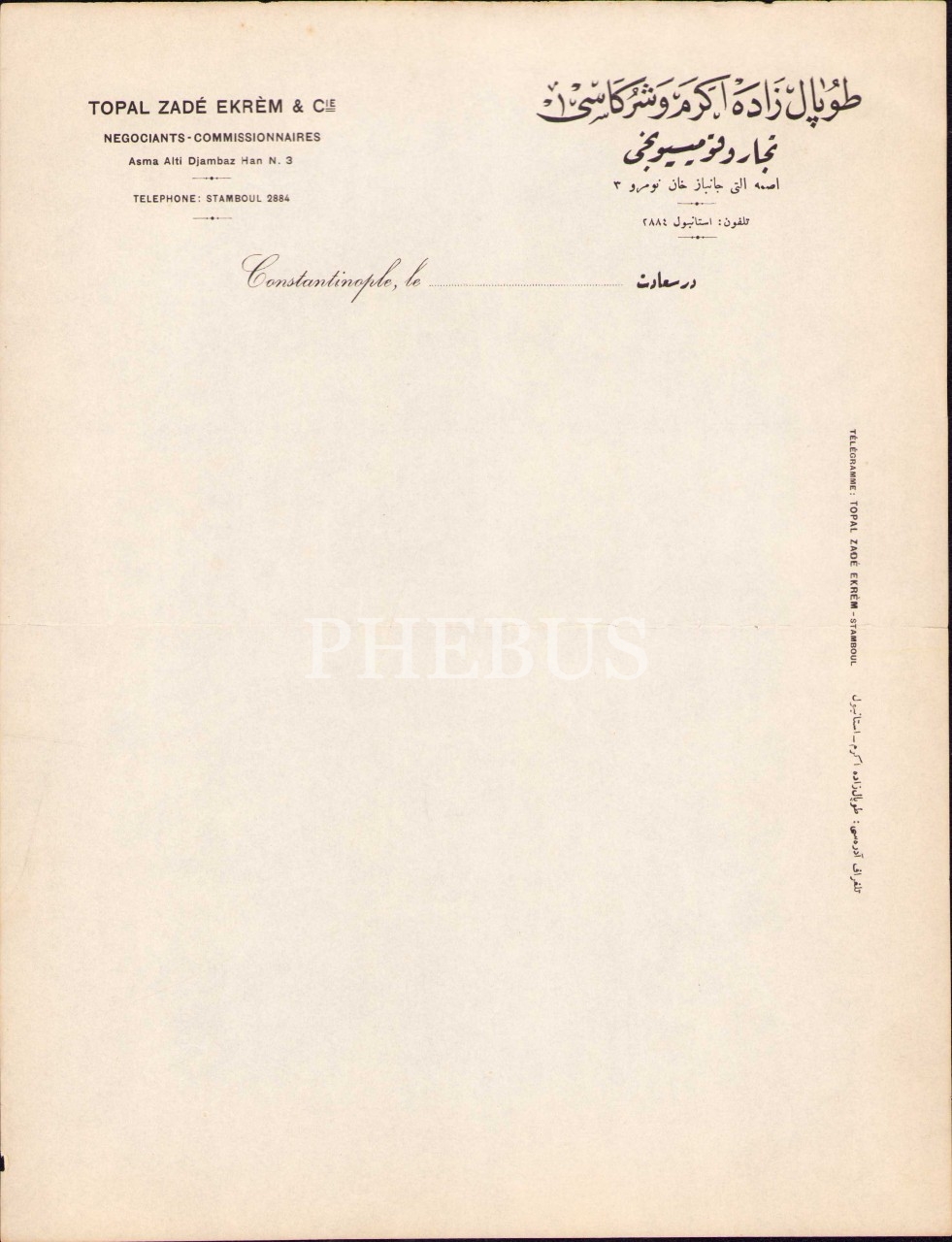 Osmanlıca-Fransızca Topalzade Ekrem ve Şürekası Tüccar ve Komisyoncu-İstanbul antetli boş kâğıt, 22x28 cm, kenarları hafif yıpranmış haliyle