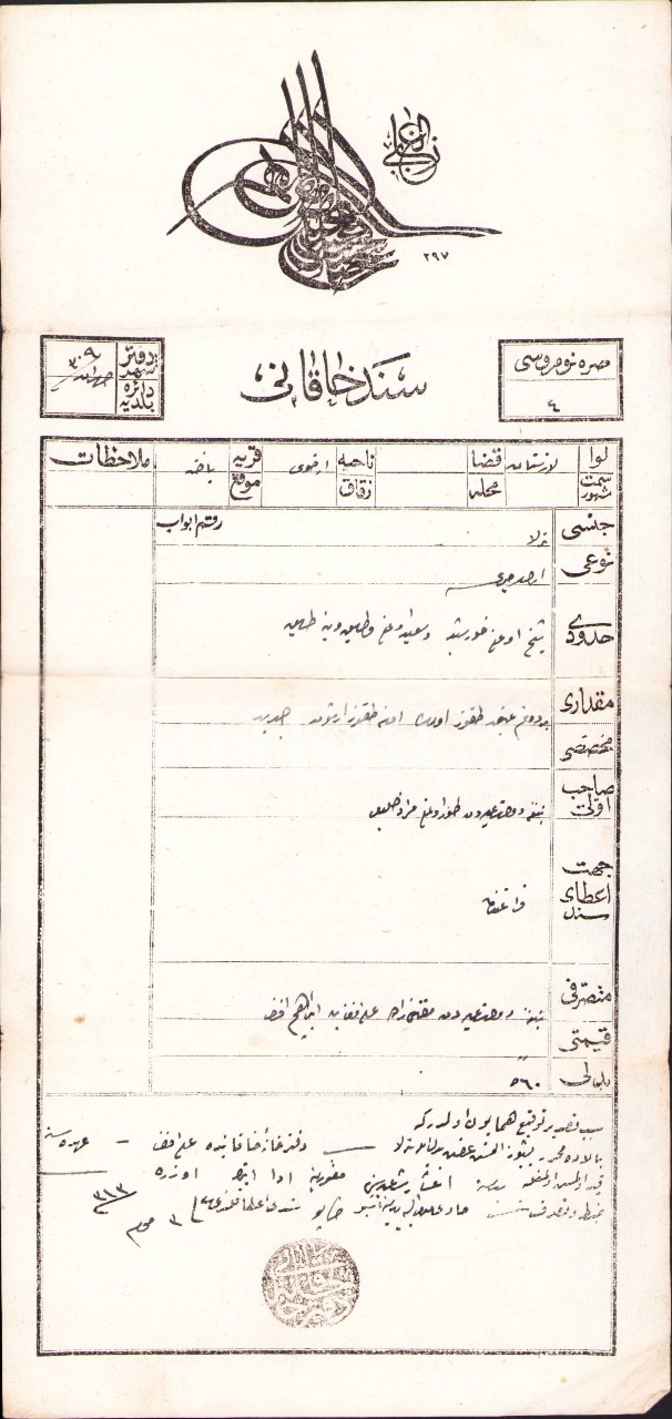 Osmanlıca Sened-i Hakanî antetli arz-ı mirî tarla tapusu, Lazistan 1313, 17x35 cm, yorgun haliyle