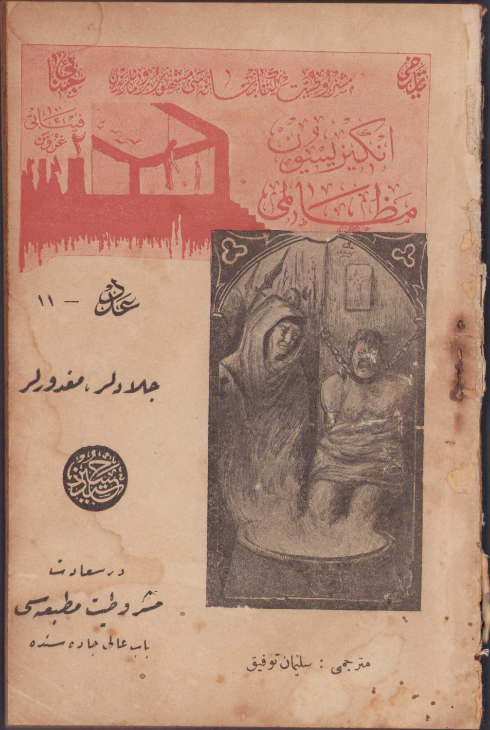 Engizisyon Mezalimi Celladlar Mağdurlar, Çeviren Süleyman Tevfik, Meşrutiyet Matbaası, Dersaadet, Osmanlıca, 128 sayfa, 12x18 cm, 11. Seri, ciltten çıkmış