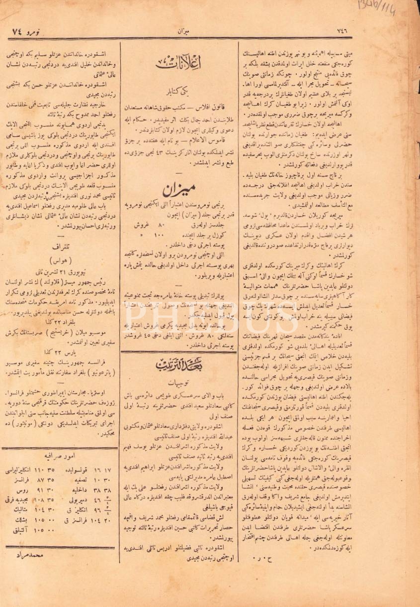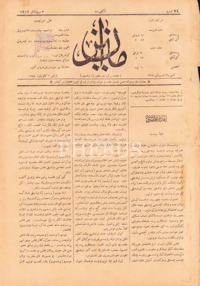 Osmanlıca Mizan gazetesi 74. sayı, 3 Rebiülahir 1306, 29x41 cm, kenarları yıpranmış haliyle
