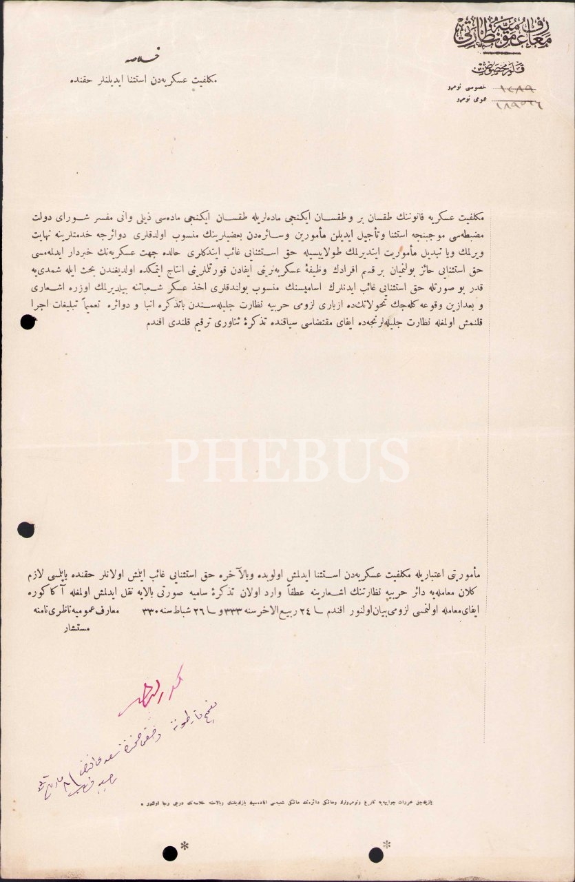 Askerlikten muaf tutulanlar hakkında Osmanlıca Maarif-i Umumiye Nezareti antetli ve 1331 tarihli evrak, 22x34 cm, hafif yıpranmış haliyle