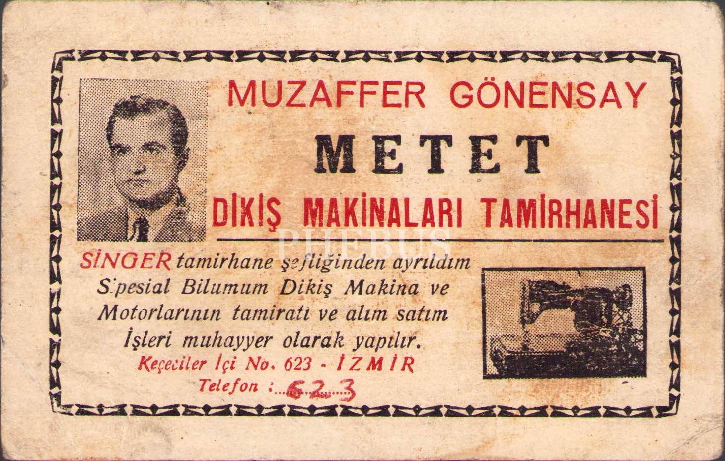 Muzaffer Gönensay Metet Dikiş Makinaları Tamirhanesi-İzmir reklam kartı, 8x12 cm, yıpranmış haliyle
