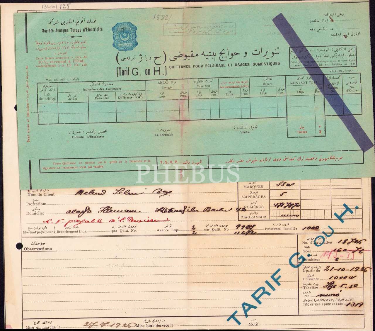 Osmanlıca-Fransızca Türk Anonim Elektrik Şirketi antetli Tenvirat ve Havayic-i Beytiyye [Aydınlatma] makbuzu, 1926-27 tarihli, 30x33 cm