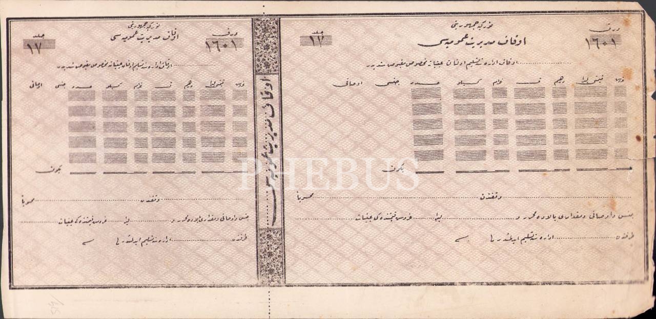 Osmanlıca Evkaf Müdiriyet-i Umumiyesi boş makbuz senedi, 15x32 cm, bir kenarı yıpranmış haliyle