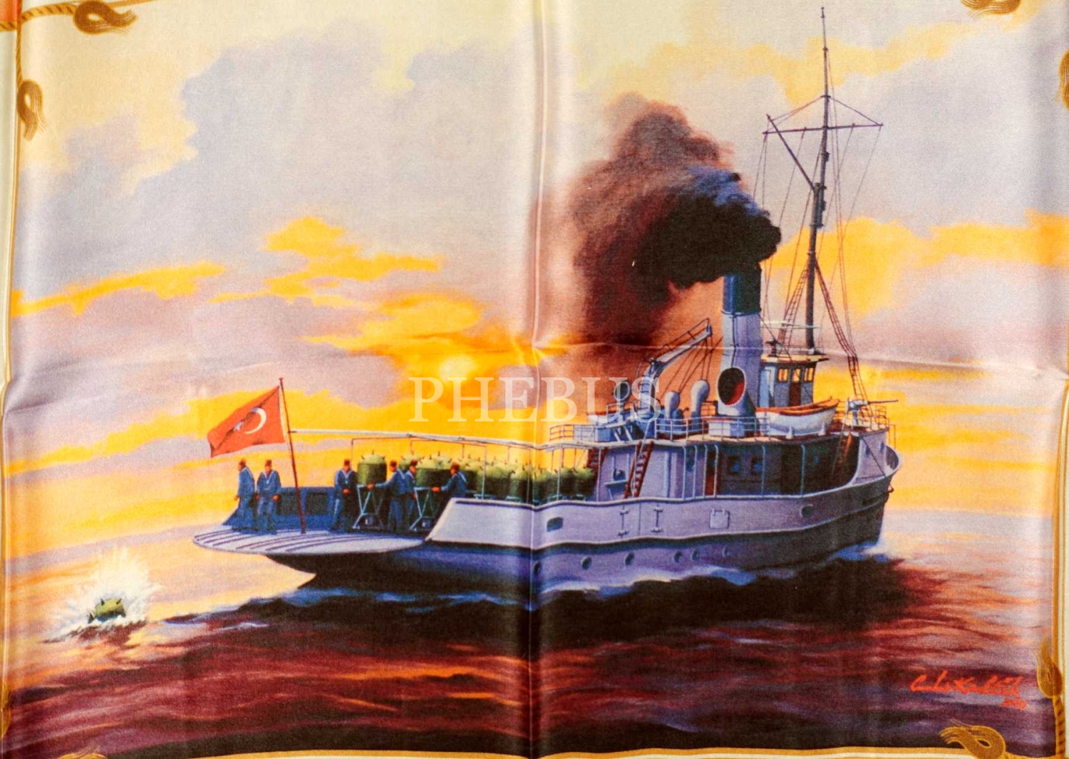 Özel paketinde "Nusret Mayın Döküşü" görselli ipek mendil, Deniz Müzesi, 39x50 cm