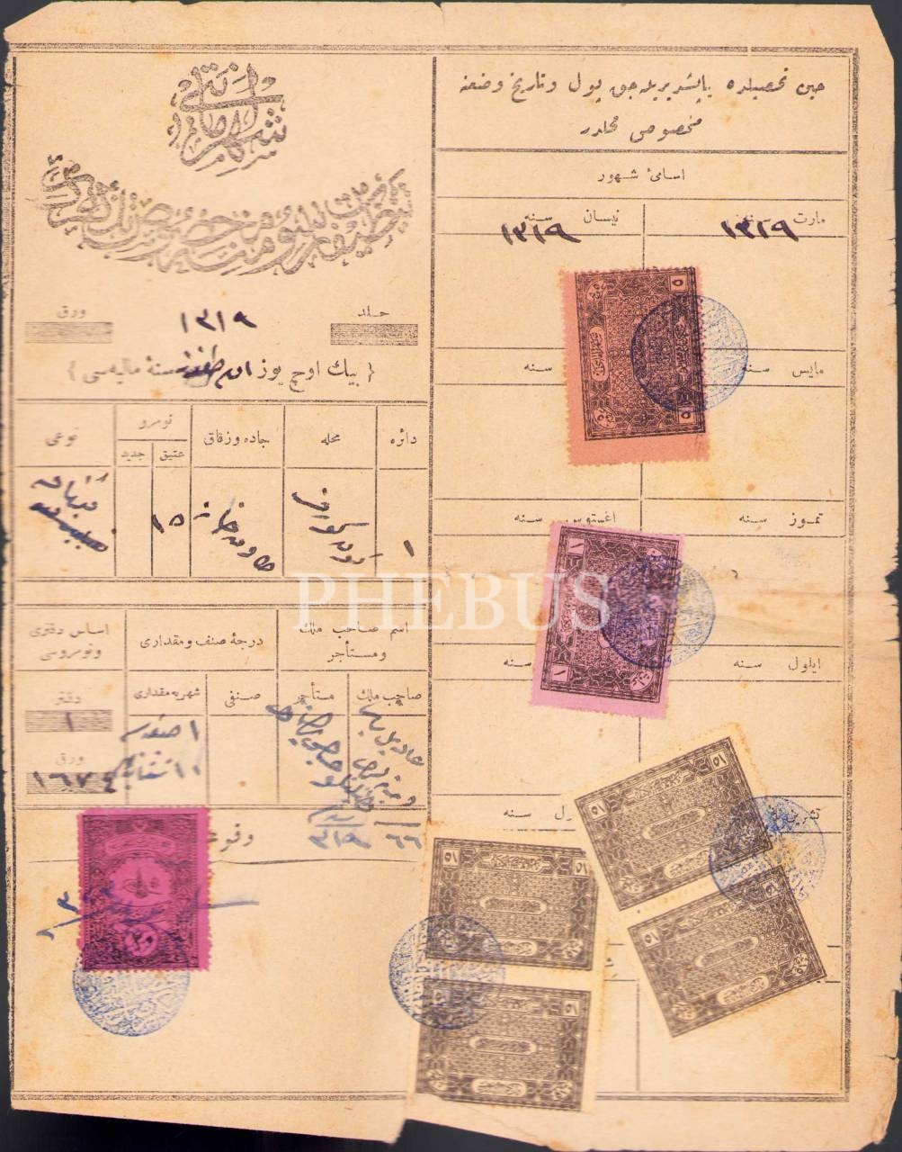 1319 ve 1322 tarihli iki adet Osmanlıca şehremaneti [belediye] temizlik vergisi makbuzu, 18x23 cm, yıpranmış halleriyle