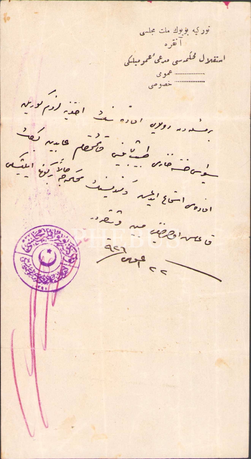 Osmanlıca TBMM Ankara İstiklâl Mahkemesi Müddei-i Umumiliği antetli ve 1926 tarihli evrak, 11x20 cm