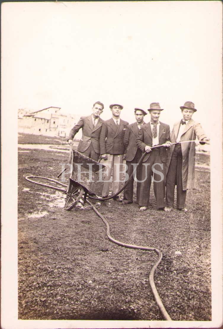 El arabası ve hortumla poz veren şık giyimli beyefendiler, 6x9 cm, kenarları hafif soyulmuş haliyle