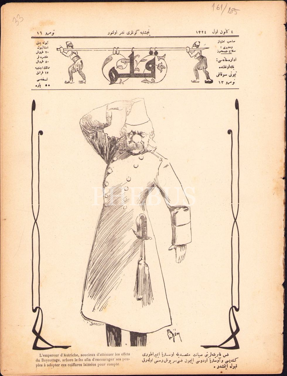 Ön kapak görsel yazısı: "Fes fabrikalarını sıyanet [koruma] maksadıyla Avusturya İmparatoru kendisi ve Avusturya ordusu için fesi serpuş-ı resmî [resmî başlık] olarak kabul etmişdir."