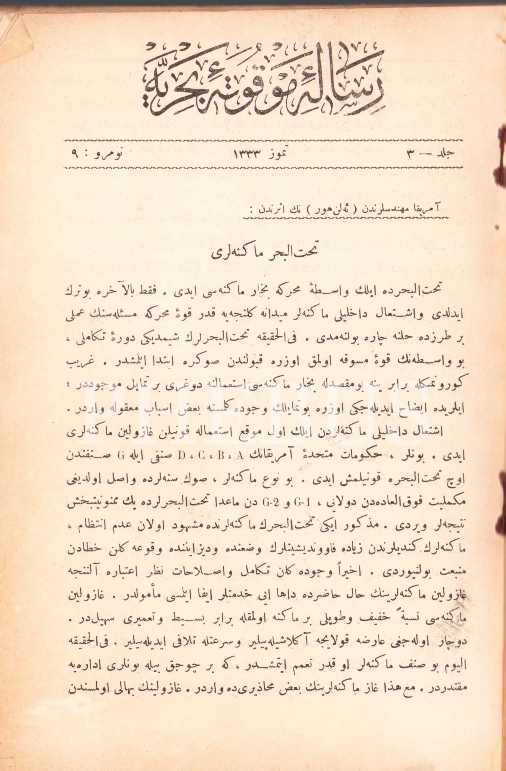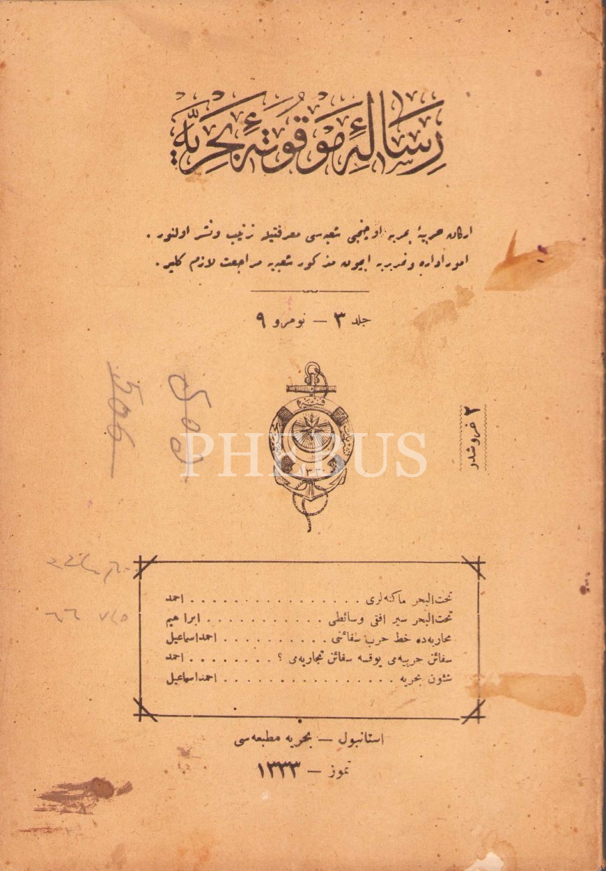 Osmanlıca Risale-i Mevkute-i Bahriye [Deniz Kuvvetleri dergisi] 9. sayı, Temmuz 1333, 16x23 cm, kapağı hafif yıpranmış haliyle