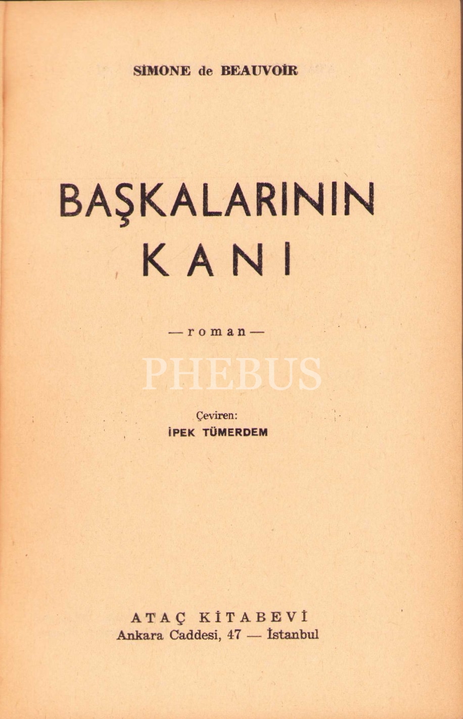 Başkalarının Kanı, Simone de Beauvoir, çev. İpek Tümerdem, Ataç Kitabevi, İstanbul 1966, 240 s., 13x19 cm, kapağı hafif yıpranmış haliyle