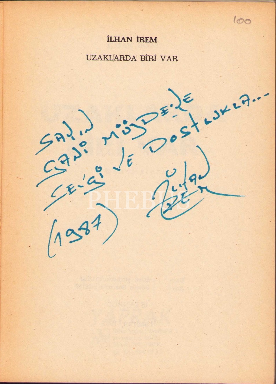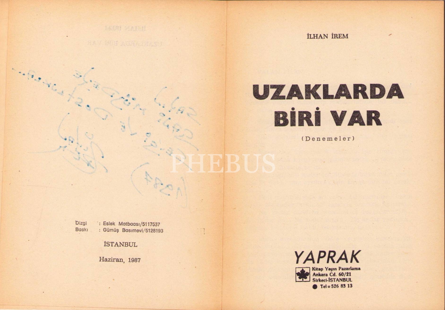 Uzaklarda Biri Var, İlhan İrem, yazarından Gani Müjde'ye ithaf ve imzalı, Yaprak Yayınları, İstanbul 1987, 127 s., 13x18 cm, kapağı hafif yıpranmış haliyle