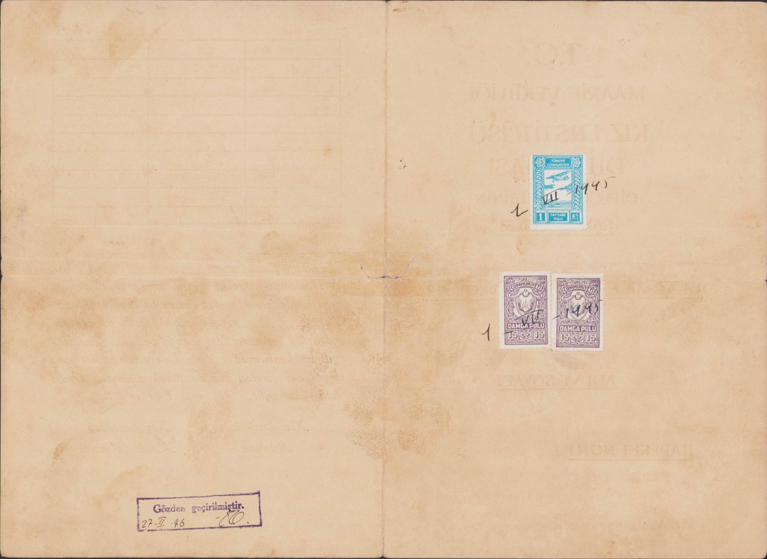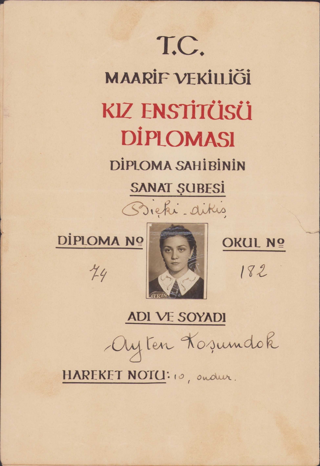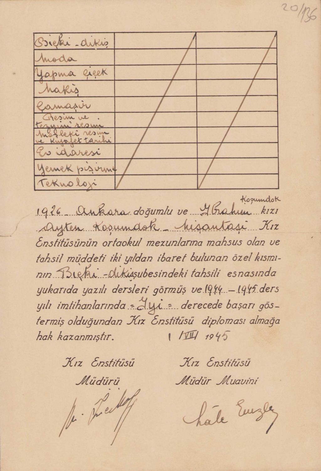 T.C Maarif Vekilliği Kız Enstitü Diploması, Biçki Dikiş bölümü, 1945