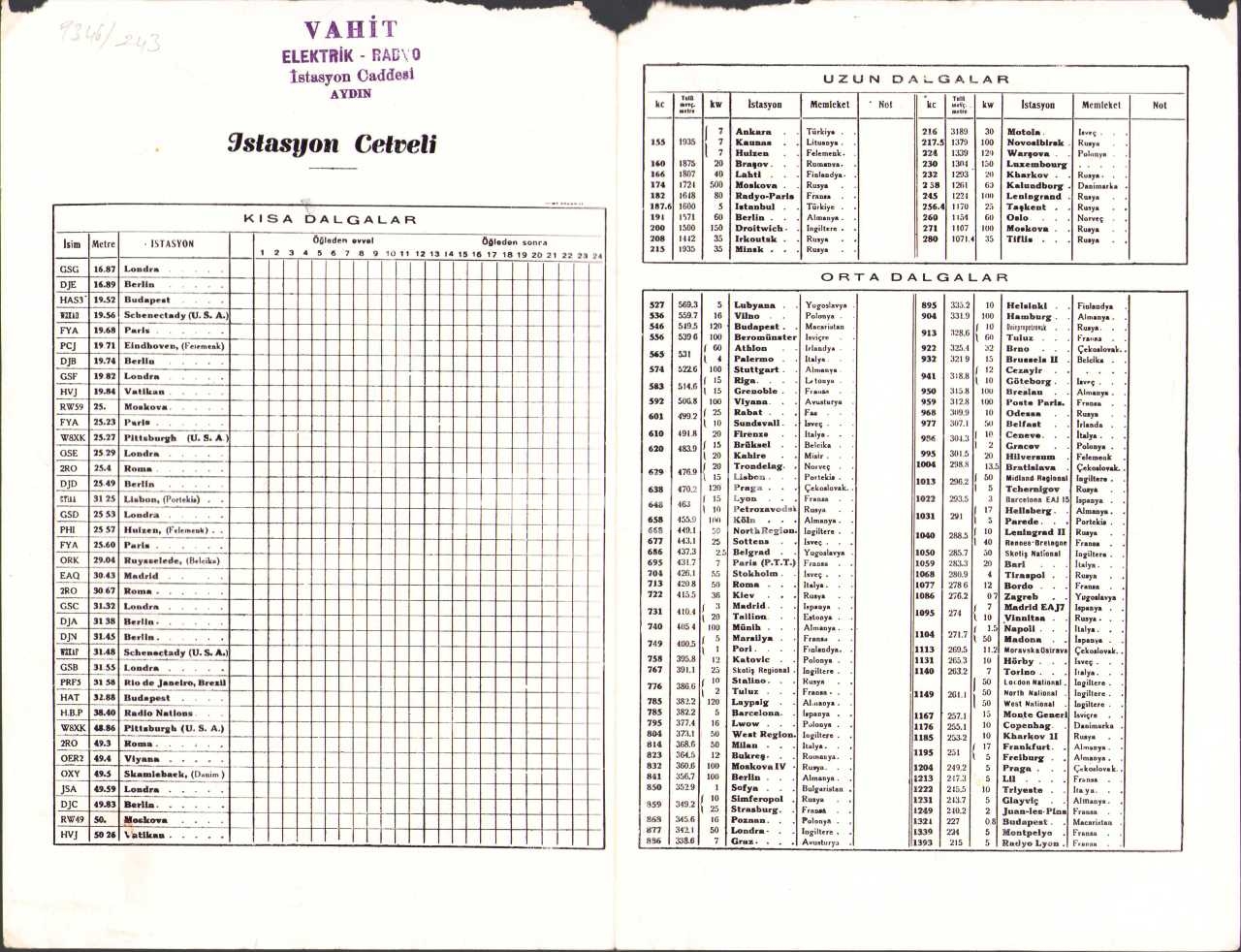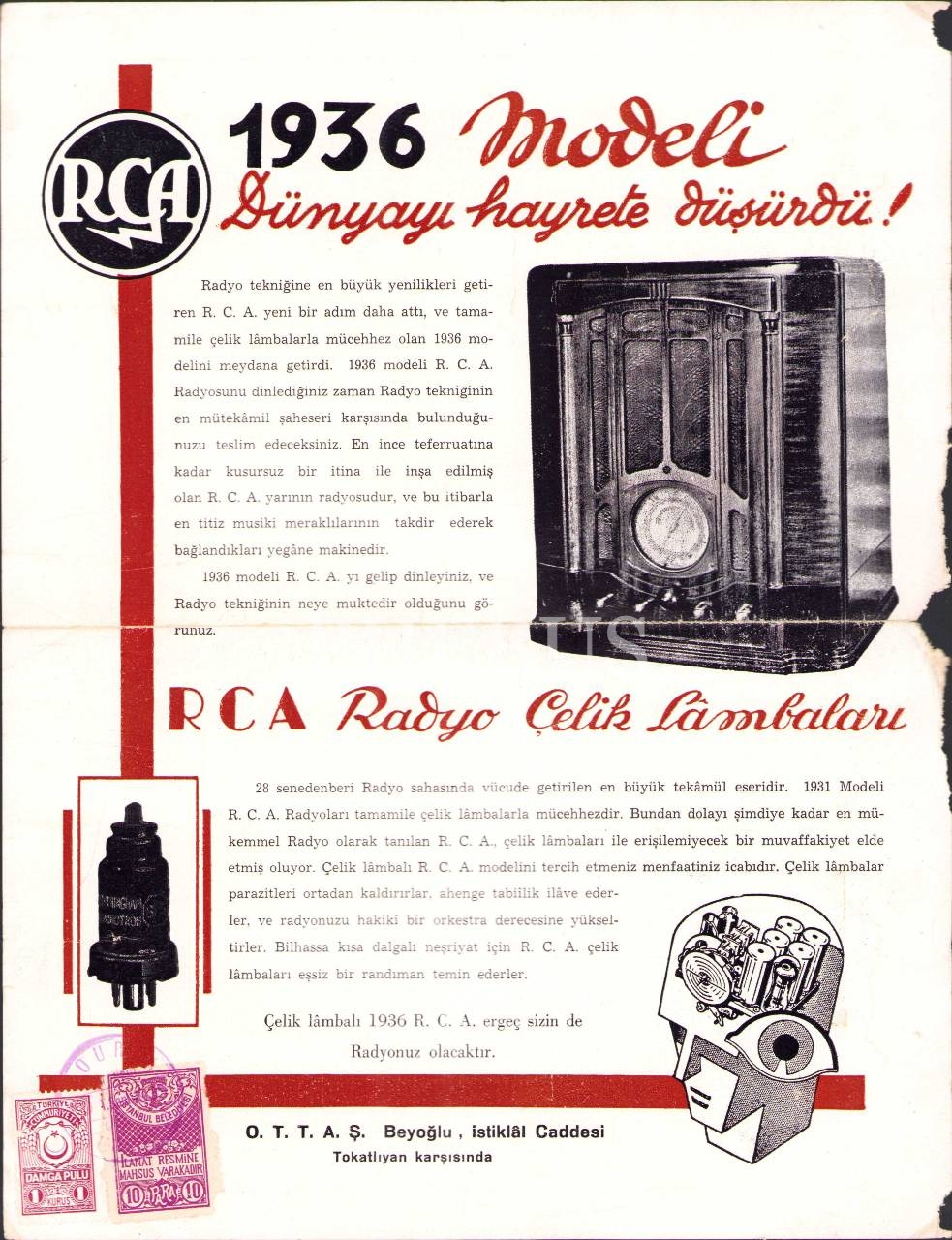 RCA Radyo Çelik Lambaları reklam kâğıdı ve istasyon cetveli, 24x31 cm, hafif yıpranmış haliyle
