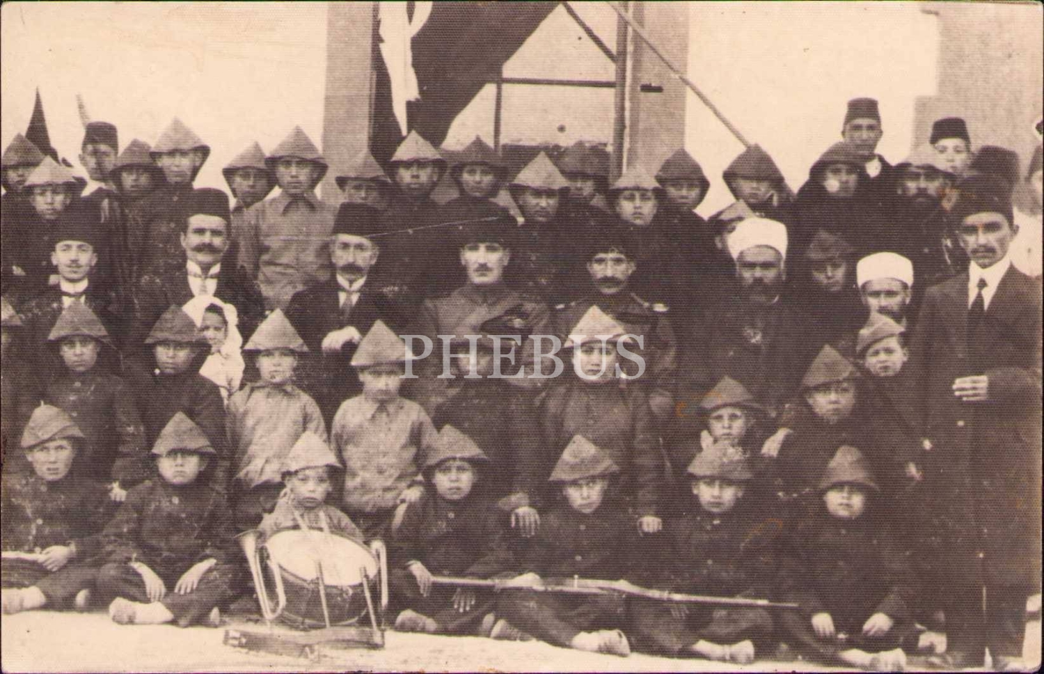 Kabalaklı çocuklar ile fesli ve sarıklı beyefendilerin yer aldığı topluluk hatıra fotoğrafı, köşeleri hafif soyulmuş haliyle