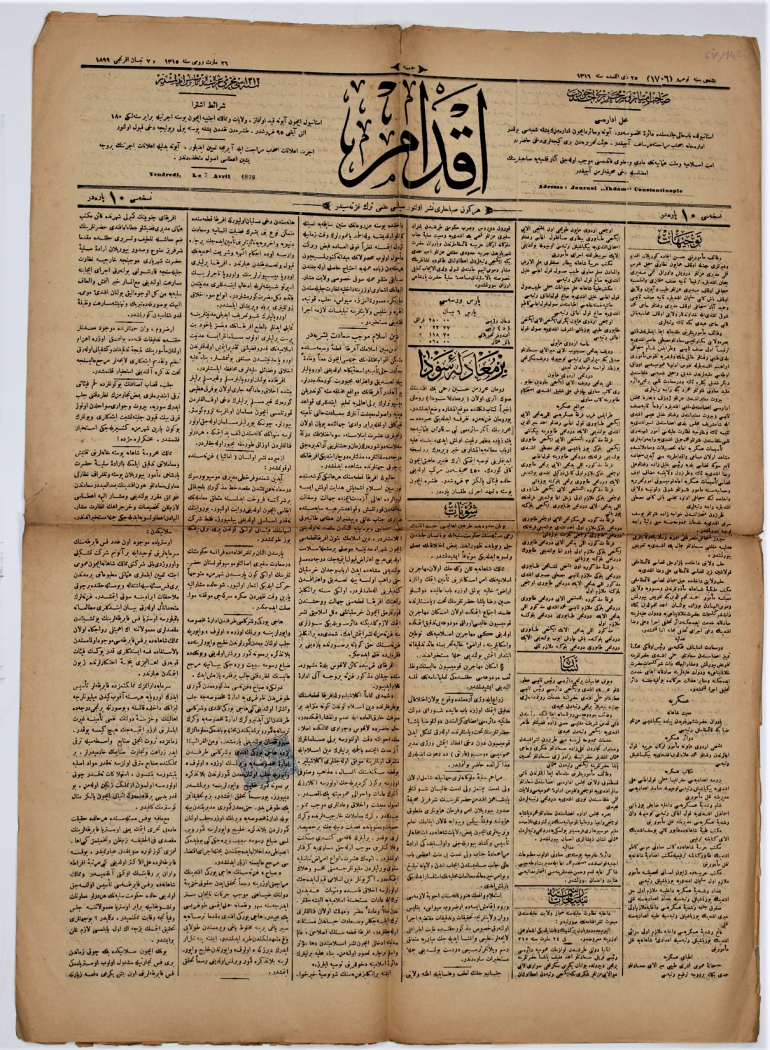 Osmanlı İkdam gazetesi, 1316 tarihli, İmtiyaz sahibi ve başyazarı Ahmed Cevad, Constantinople, 4 sayfa, 46x64cm