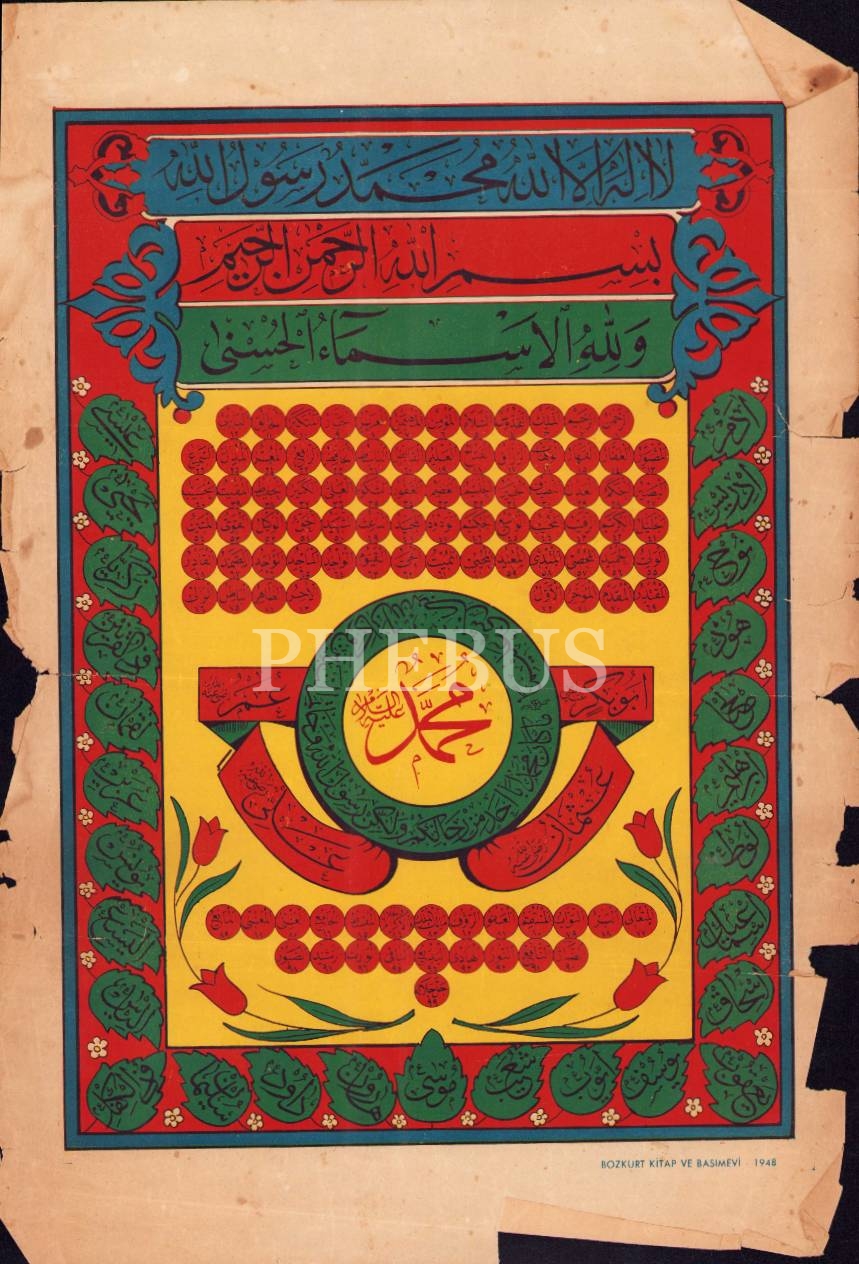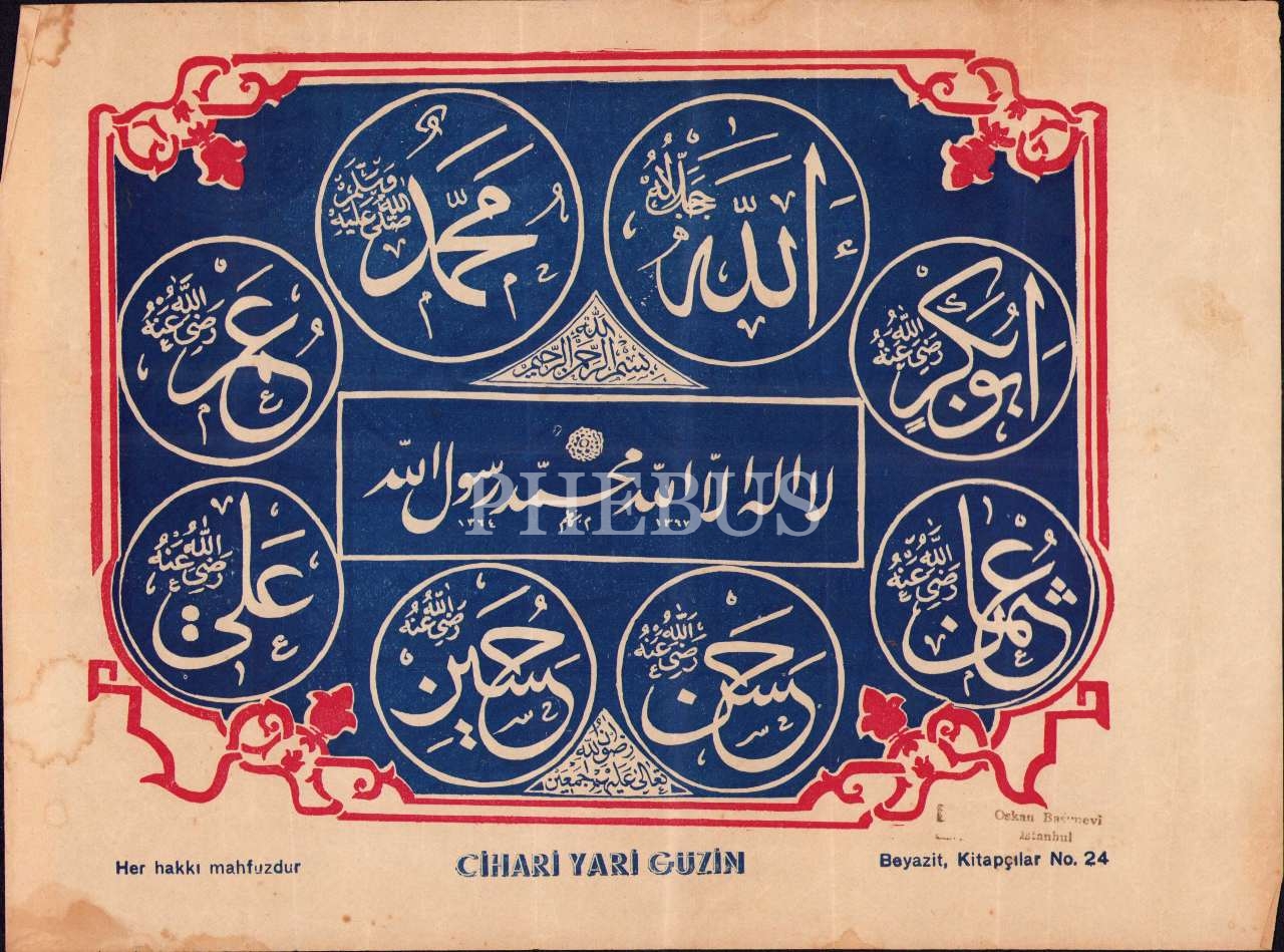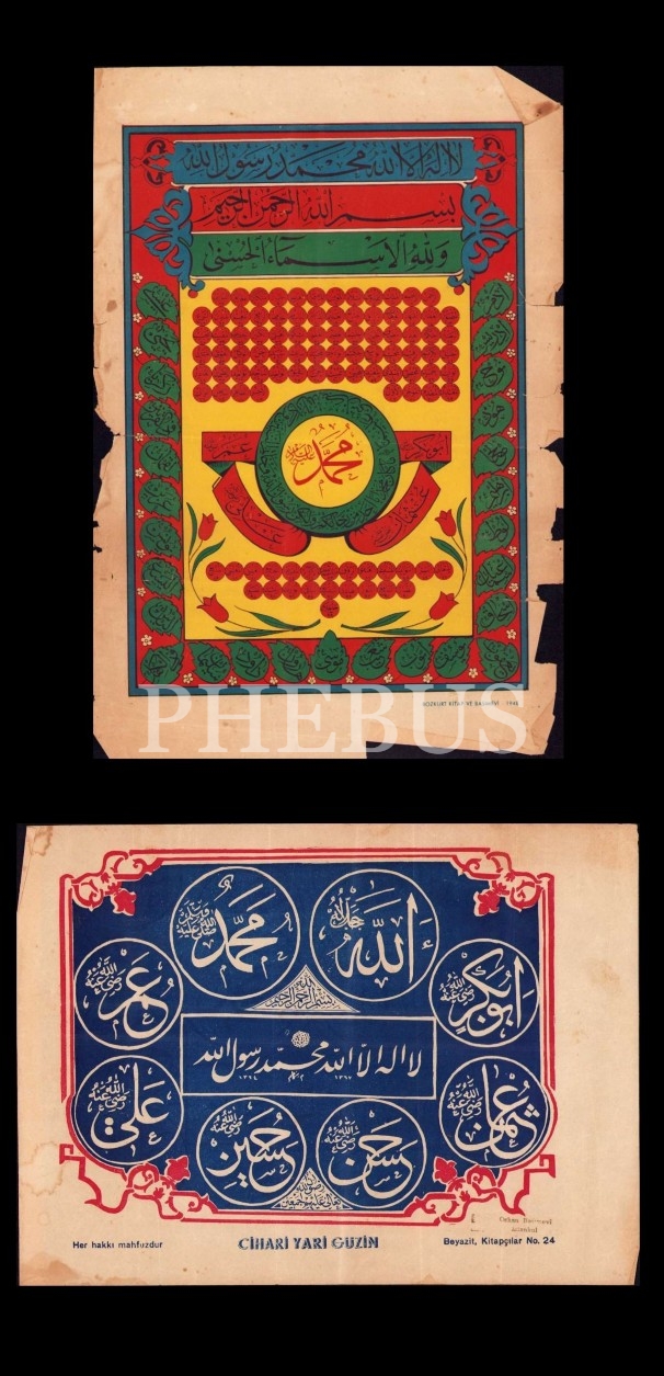 Çihar Yar-ı Güzin [4 Halife] ile Esma-i Hüsna, Peygamberlerin İsimleri ve 4 Halife posterleri, 2 adet, 28x41 ve 24x33 cm, biri epey diğeri hafif yıpranmış haliyle