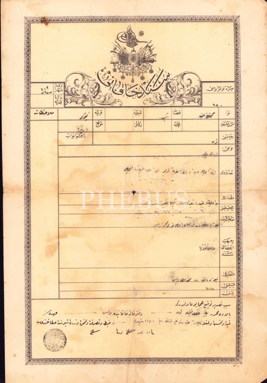 Osmanlıca Sened-i Hakanî antetli arz-ı mirî tarla tapusu, 1321 tarihli, 28x41 cm, yer yer mürekkebi karışmış ve yıpranmış haliyle