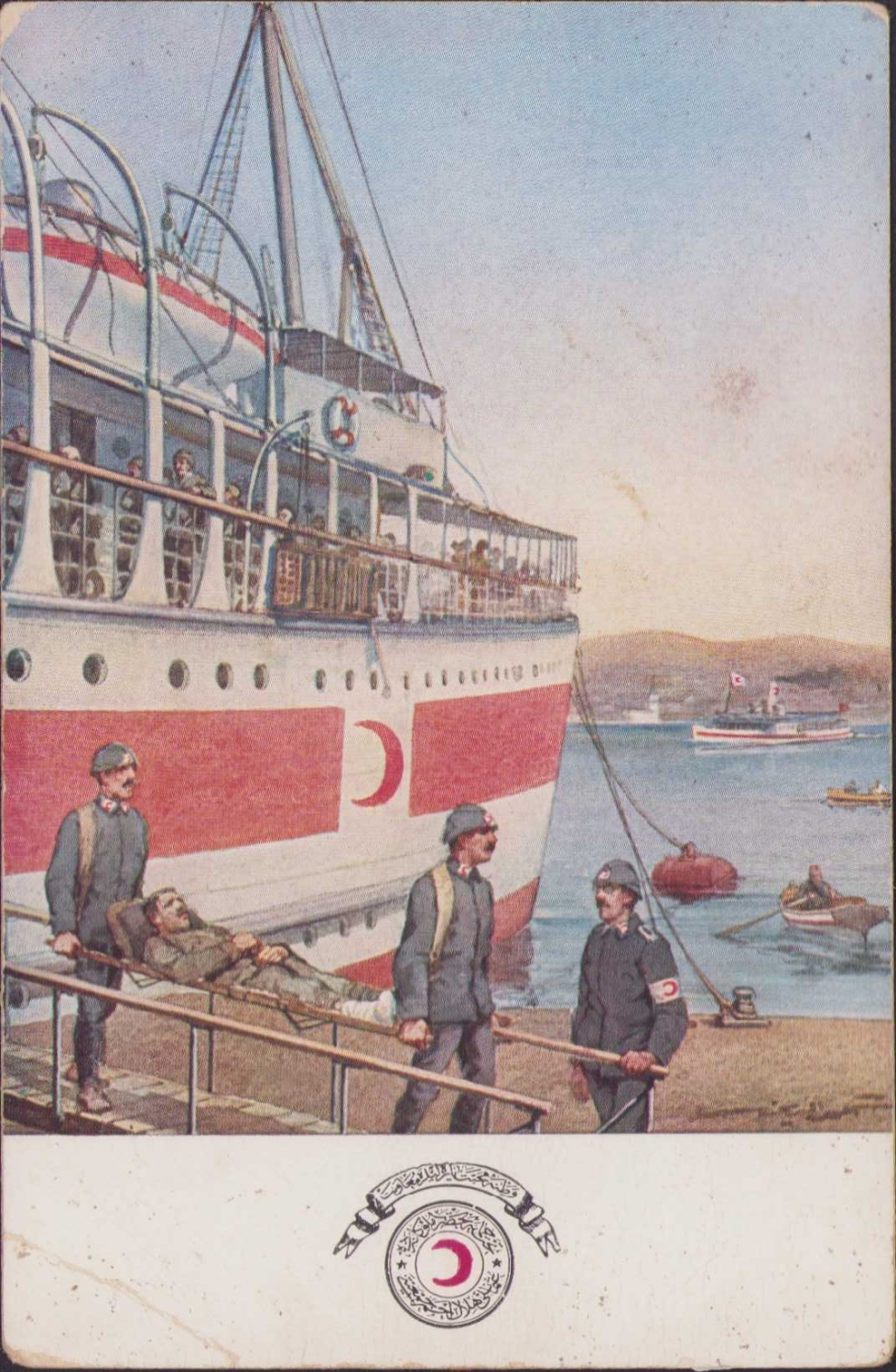 Osmanlı Hilali Ahmer yaralı askerler İstanbul'a getiriliyor, arkası Mebde-i Servet Osmanlı Ticarethanesi damgalı
