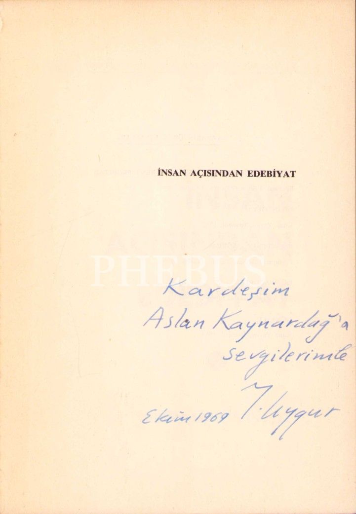 Yazar ve Felsefeci Nermi Uygur'dan Felsefeci, Yayıncı ve Sahaf, Aslan Kaynardağ'a İthaflı ve İmzalı "İnsan Açısından Edebiyat", İÜ Edebiyat Fakültesi Yayınları 1969, 172 sayfa, 14x20 cm