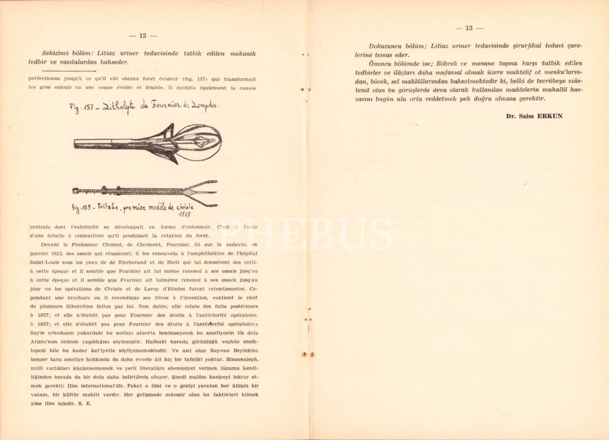 İthaf, "Sayın genel sekreterim B. F... Zühtü, derin saygı ve sevgi, 12.1" şeklindedir. Eserde Üroloji ile ilgili İngilizce, Fransıızca ve Türkçe bölümler vardır.