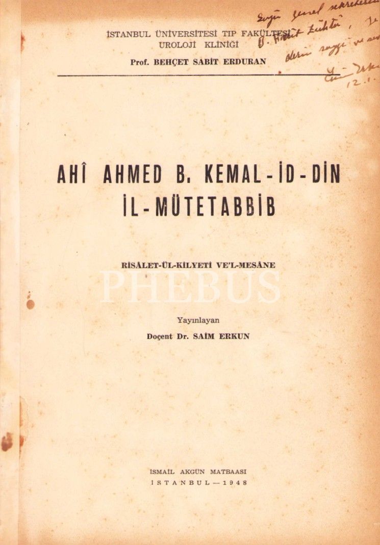 Saim Erkun'dan İthaflı ve İmzalı "Ahî Ahmed B. Kemal-id-din İl-Mütetabbib: Risâlet-ül Kilyeti Ve'l-Mesâne", İsmail Akgün Matbaası 1948, 78 sayfa, 16x24 cm