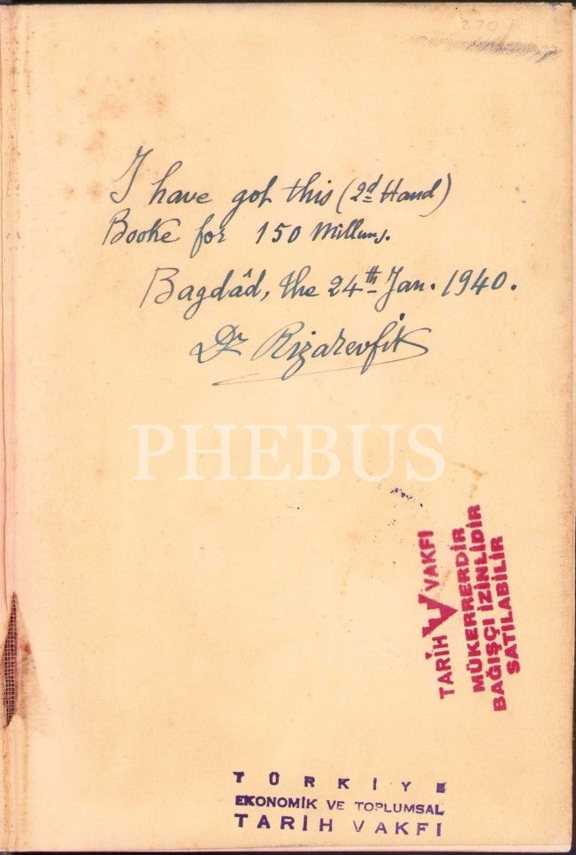 Kitaba "I have got this (2nd hand) book for 150 millons. Bagdâd, the 24th-Jan. 1940. Dr. Rıza Tevfik" şeklinde not düşülmüştür.