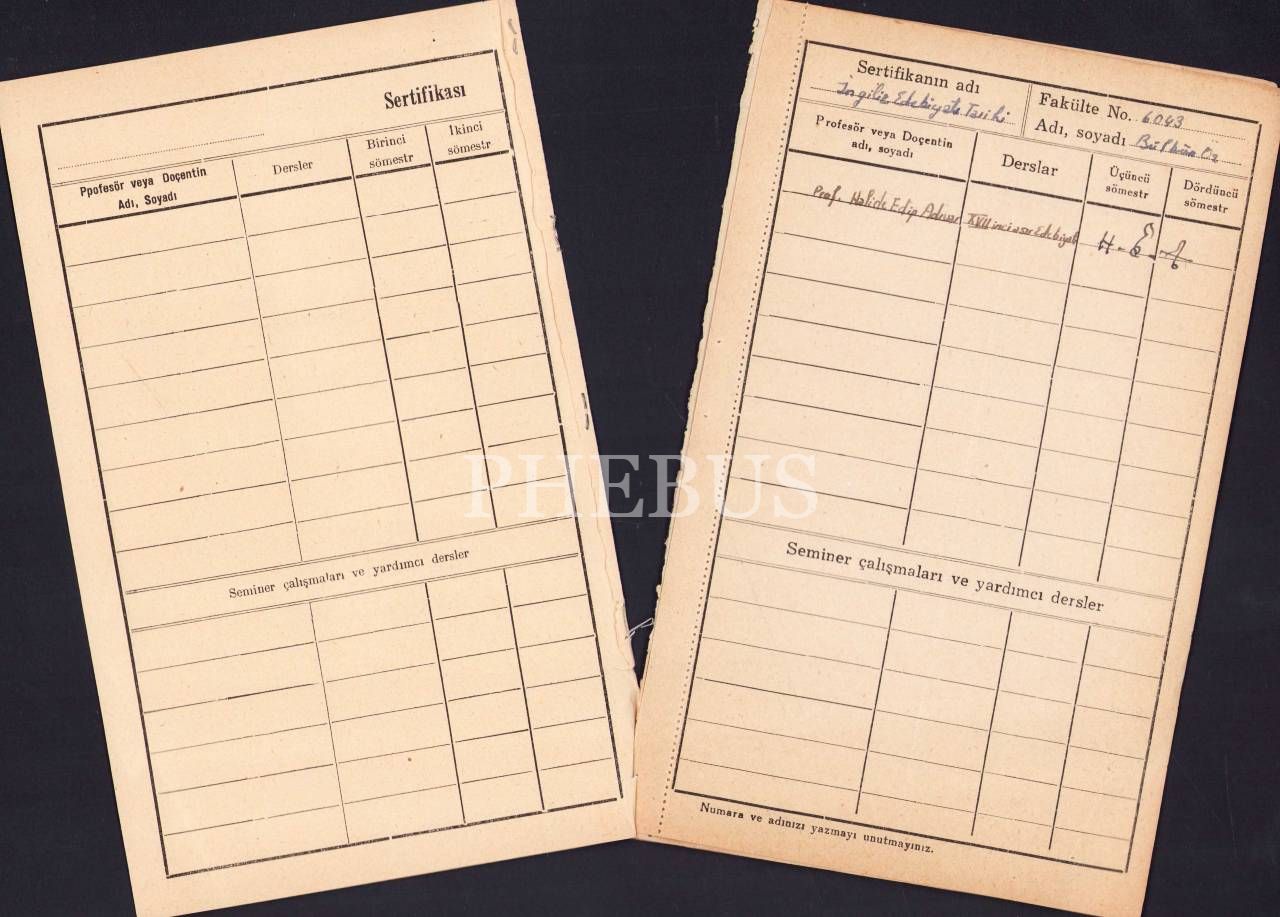 Halide Edip [Adıvar]'dan İmzalı İngiliz Edebiyatı Tarihi Sertifikası, 4 sayfa, 12x20 cm