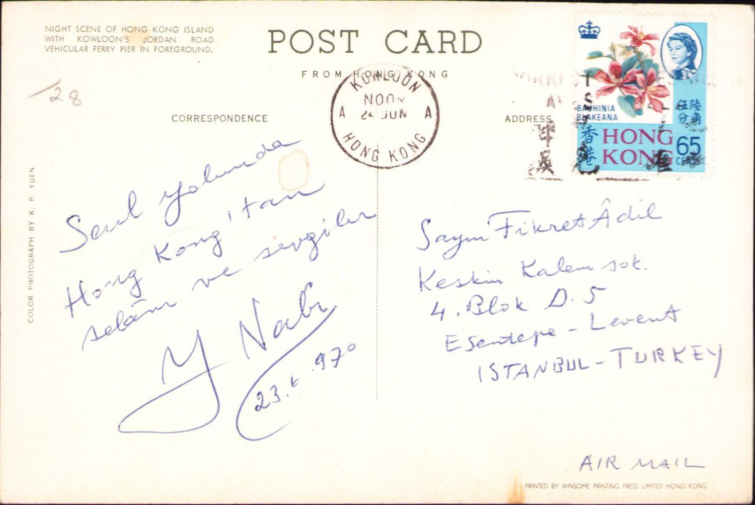 Kartpostalın arkasına "Seul yolunda Hong Kong'tan selâm ve sevgiler, Y. Nabi 23.6.970" şeklinde not düşülmüştür.