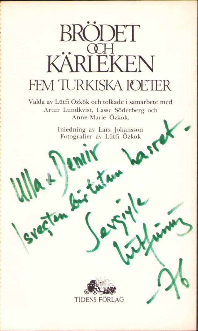 Türk Edebiyatının Mühim İsimlerinin İsveççeye Çevrilen Şiirlerini İhtiva Eden ve Derleyicisi Lütfi Özkök'ten İthaflı ve İmzalı "Brödet Och Karieken Fem Turkiska Poeter" Kitabı, Tiden Förlag 1976, 80 sayfa, 11x19 cm