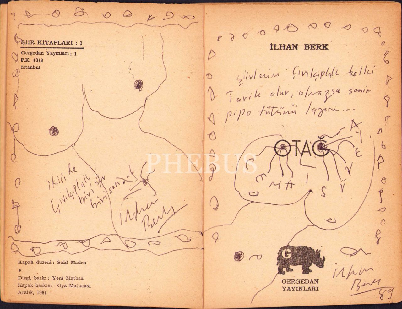 İlhan Berk'ten Cemal Süreya'ya İthaflı ve İmzalı, Muhtelif Çizimlerin Olduğu "Otağ" Kitabının İlk Baskısı, Gergedan Yayınları, 31 sayfa, 14x20 cm