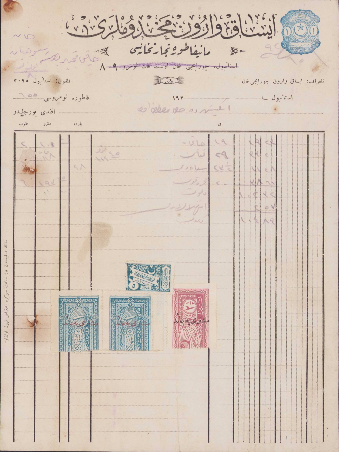 Osmanlı Musevi İsak Varon Mahdumları Manifatura Ticarethanesi Antetli Fatura, pullu, 20x26cm