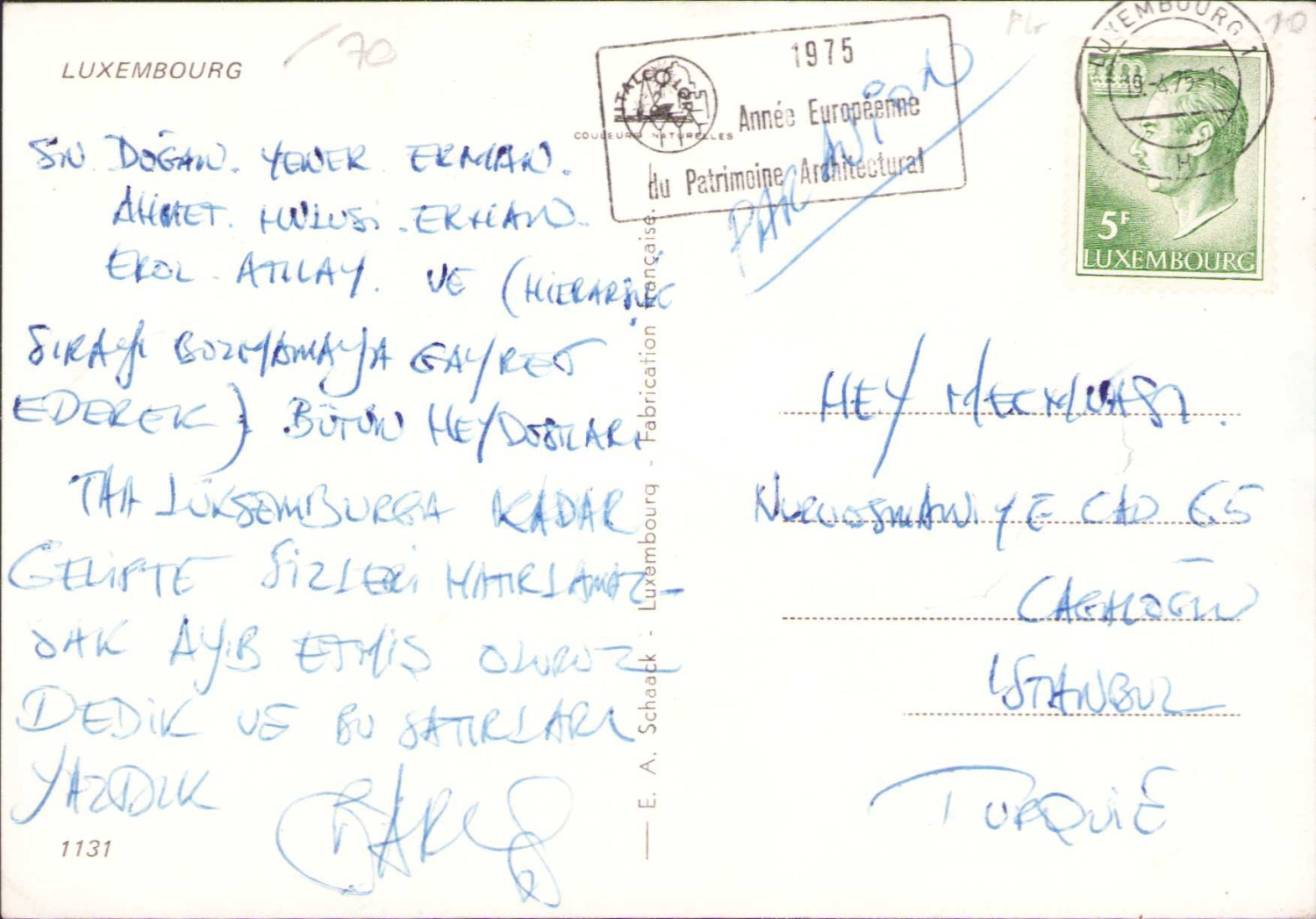 "Sn. Doğan. Yener. Erman. Ahmet. Hulusi. Erhan. Erol. Atilay ve (Hiyerarşi sırasını bozmamaya gayret ederek) Bütün Hey Dostlar. Taa Lüksemburg'a kadar gelipte sizleri hatırlamazsak ayıb etmiş oluruz dedik ve bu satırları yazdık - Barış"