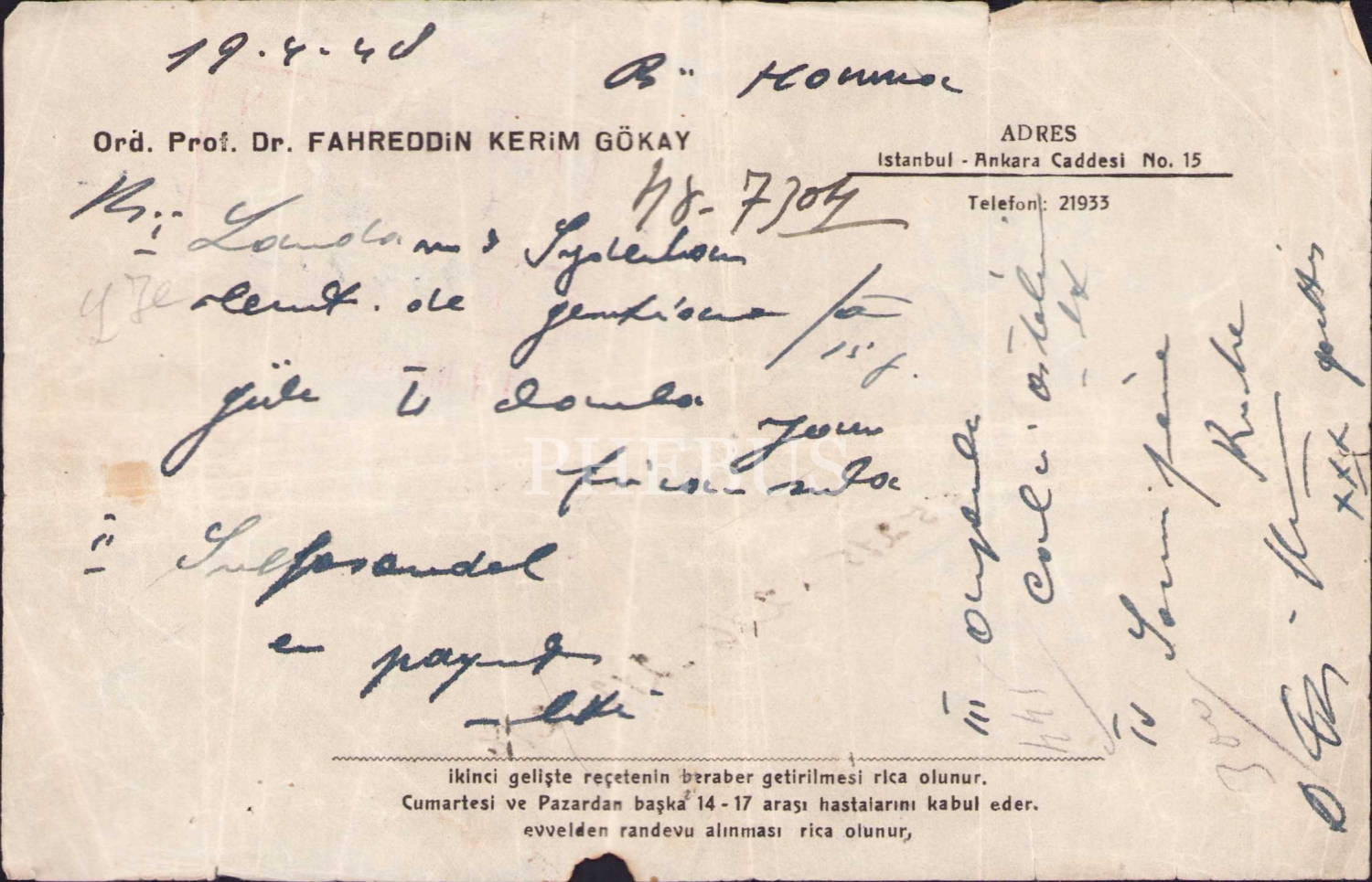 Ord. Prof. Fahrettin Kerim Gökay'ın Hekimlik Yıllarına Ait Reçete, Fahrettin Kerim Gökay Antetli Kağıda El Yazısıyla Yazılmıştır, 12x19 cm