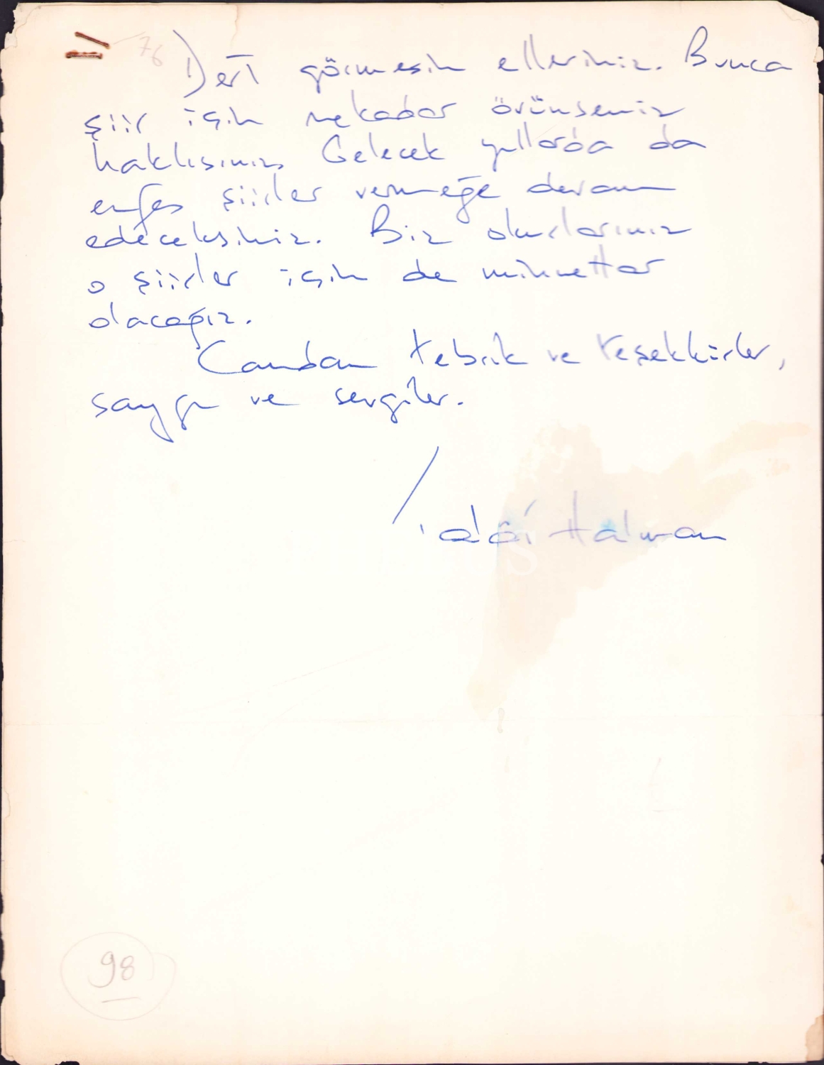 Mektup'da Talat Halman, Şair Arslan Yanardağ'ın şiir kitabı "Sevgiler de Gündemdedir" için Şair'e teşekkür etmiş, şiirleri ile ilgili görüşlerini belirtmiştir.