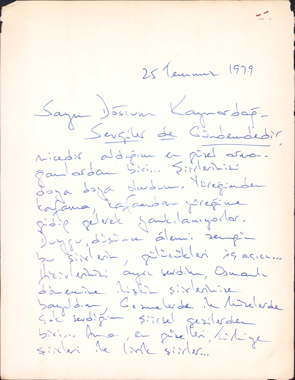 Türkiye'nin İlk Kültür Bakanı Talat Halman'dan Felsefeci, Yayıncı ve Sahaf Arslan Kaynardağ'a Gönderilmiş Islak İmzalı Mektup, 2 sayfa, 22x28 cm
