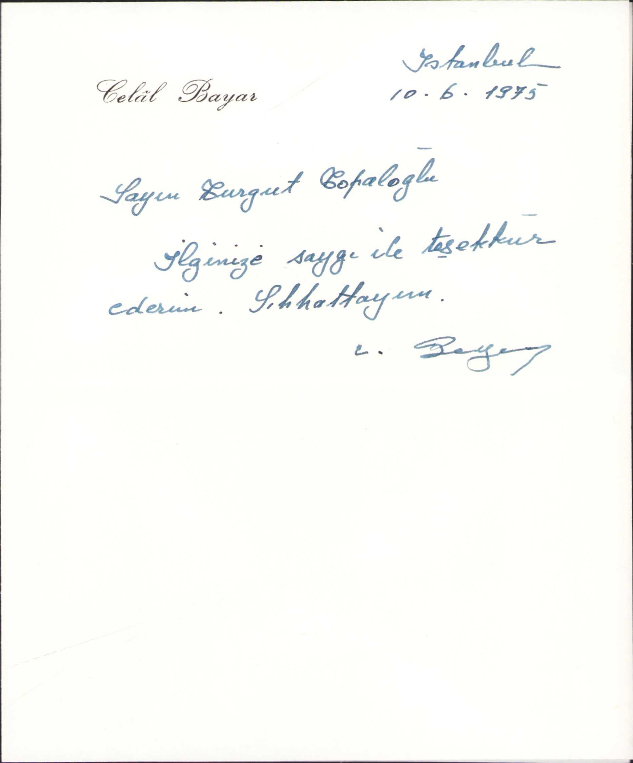 İçerik "Sayın Turgut Topaloğlu, ilginize saygı ile teşekkür ederim. Sıhattayım. İstanbul 10.6.1975 Celal Bayar" şeklindedir.