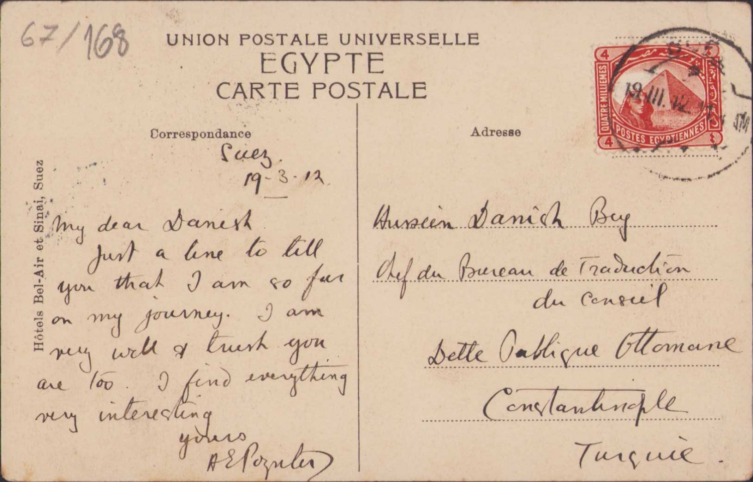 Yazar, şair Hüseyin Daniş'e gönderilmiş kartpostal, Mısır Suez