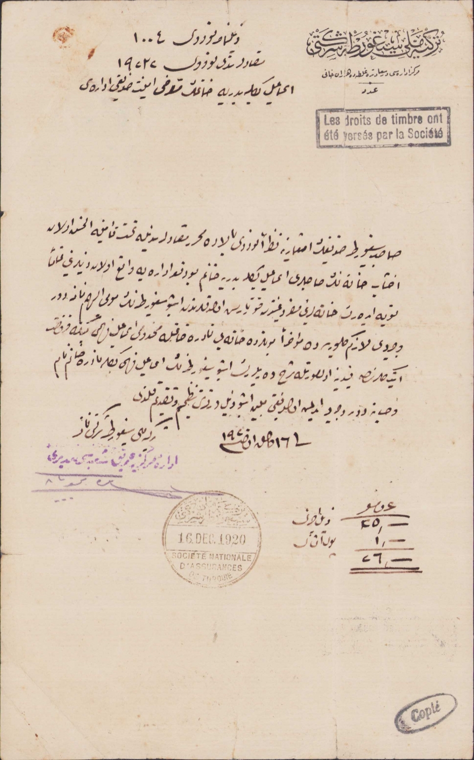 Osmanlı Türkiye Milli Sigorta Şirketi'ne ait mukavelesi, 1920 tarihli, Societe Nationale D'assurances damgalı, 16x24cm