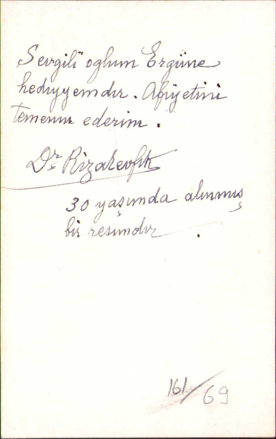 Fotoğrafın arkasında "Sevgili oğlum Ergüne hediyemdir. Afiyetini temenni ederim. Dr. Rıza Tevfik, 30 30 yaşımda alınmış bir resimdir" şeklinde not düşülmüştür.
