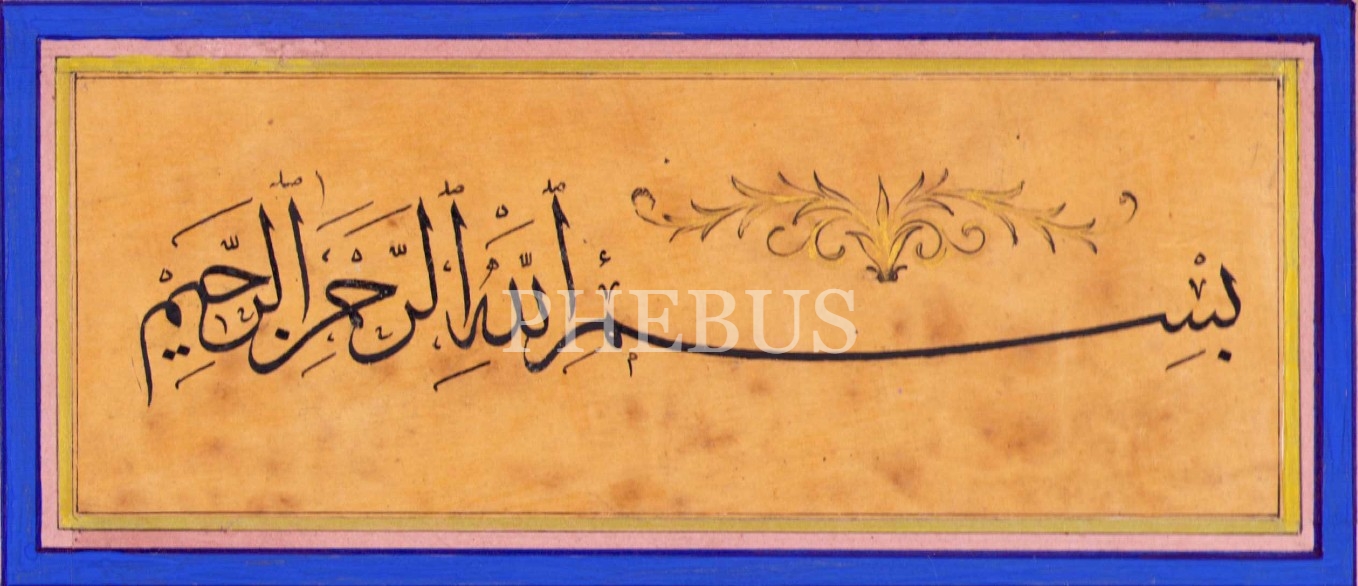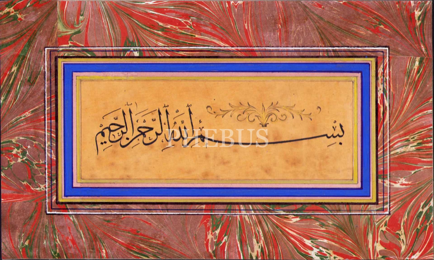 Sülüs Besmele-i Şerif, ebru pervazlı ve tezhipli, 18x30 cm