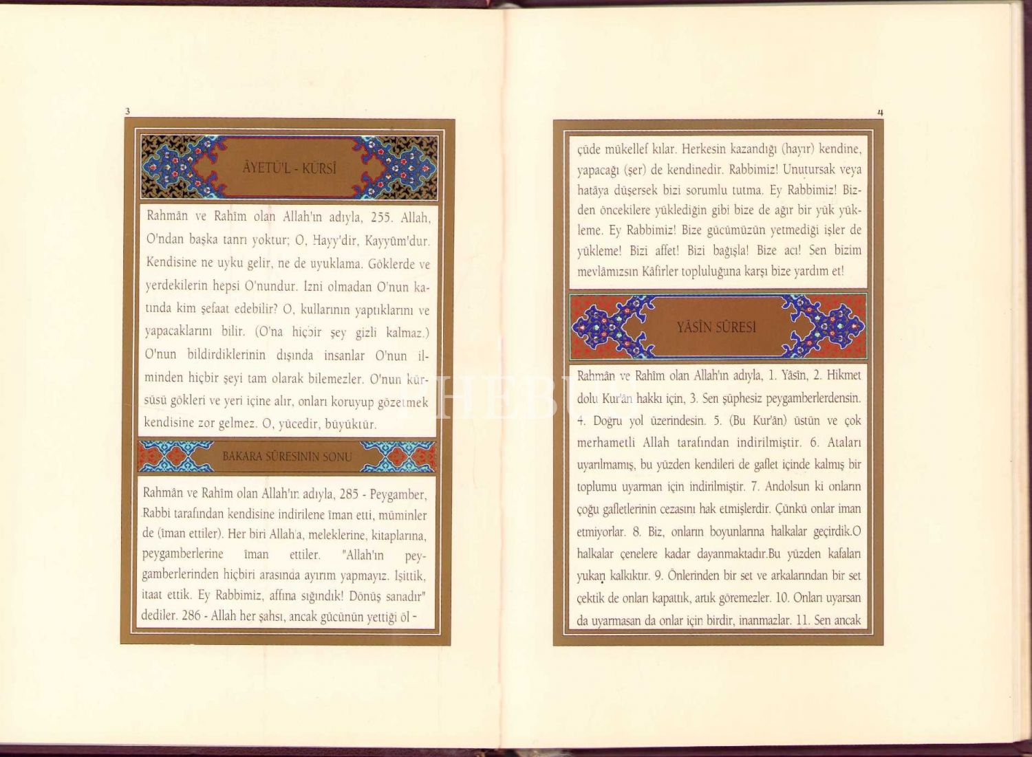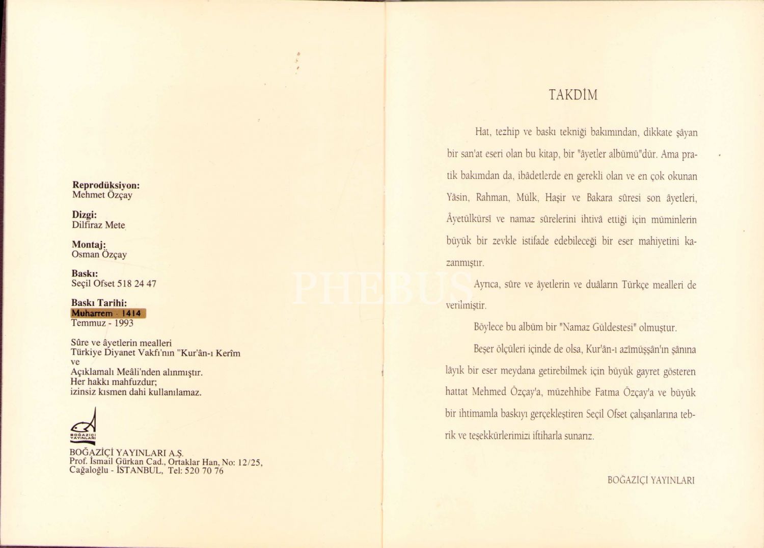 Namaz Güldestesi [Yâsîn Cüzü ve Meali], haz. Hattat Mehmed Özçay-Müzehhibe Fatma Özçay, Boğaziçi Yayınları, İstanbul 1993, 42 s., 14x20 cm, cildi yıpranmış haliyle