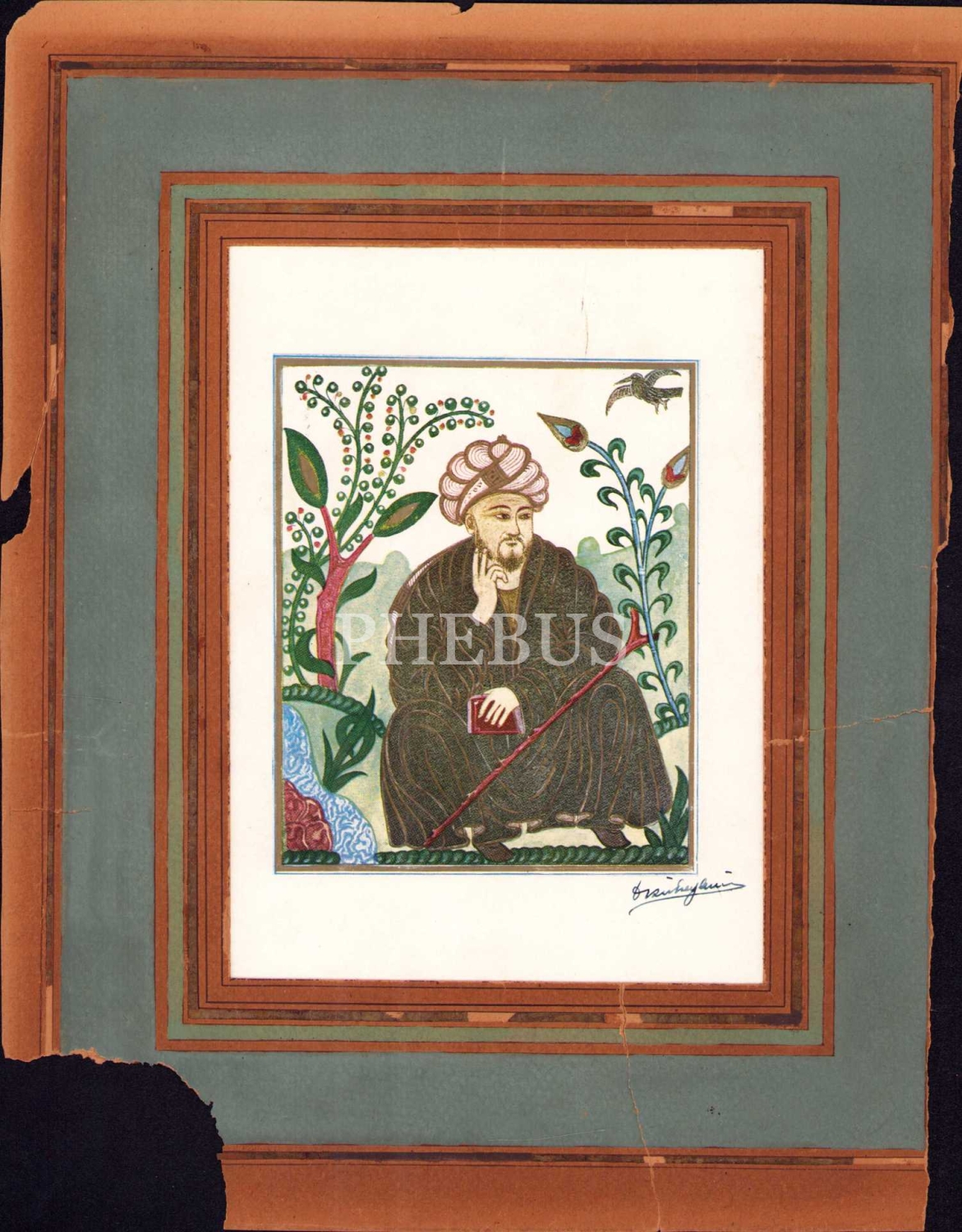 Ahmed Süheyl Ünver ıslak imzalı Süheyl Ünver Çizimi Baskı Minyatür, 11x14 cm, karton çerçevesinin kenarları yırtılmış haliyle