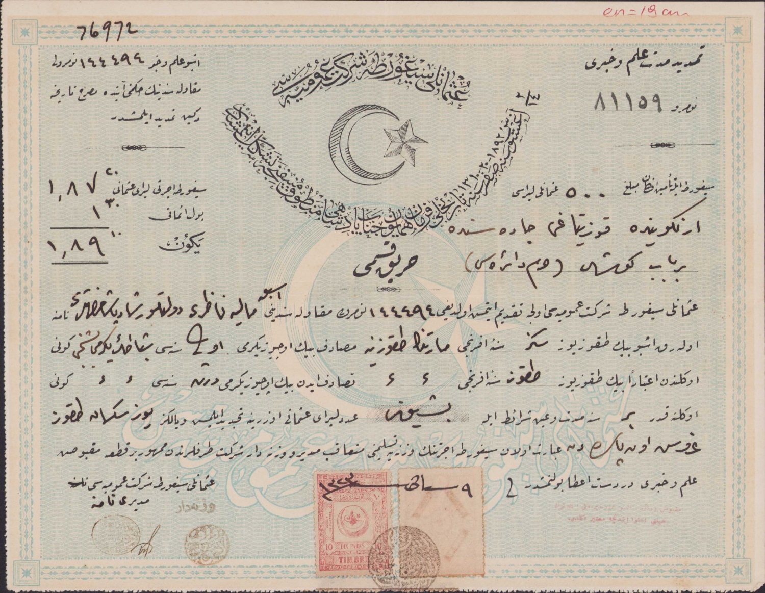 Osmanlı Sigorta Şirketi Umumiyesine ait büyük boy makbuz, Erenköy - Kozyatağı, 1323 tarihli, pullu, mühürlü, 26x21cm