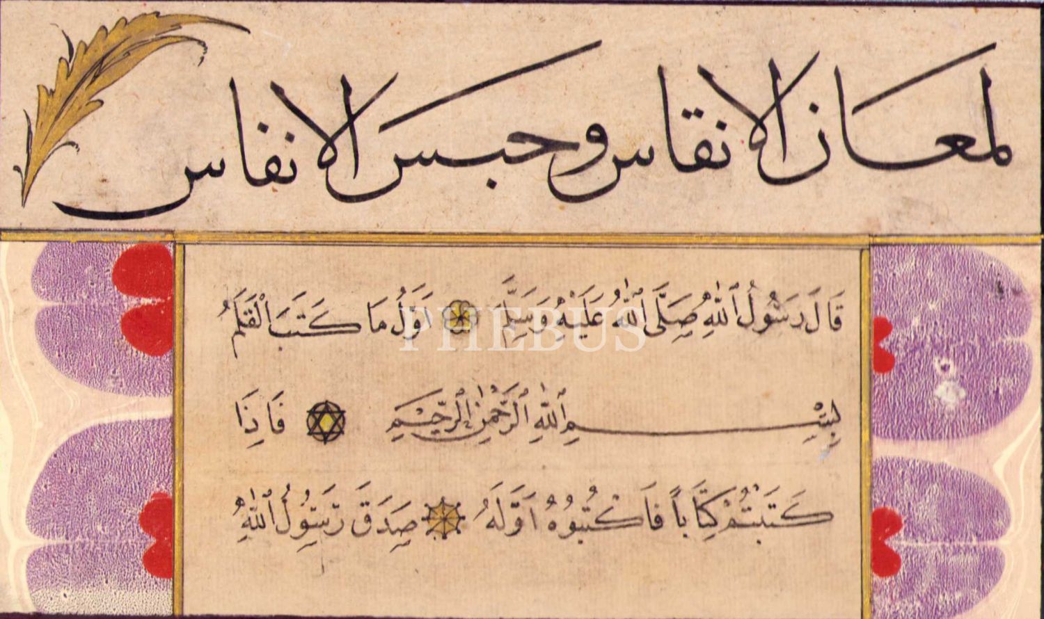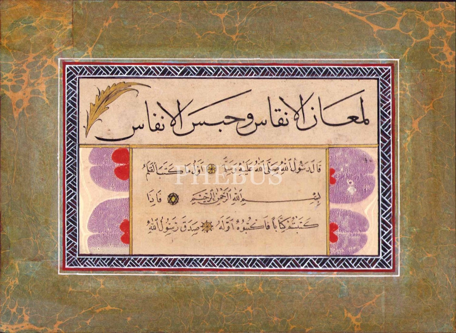 Sülüs Meşk ve Nesih Hadis-i Şerif: "Kalemin yazdığı ilk şey besmeledir. Bir şey yazdığınızda ilk önce onu yazın", ebru pervazlı, yazı: 12x19 cm