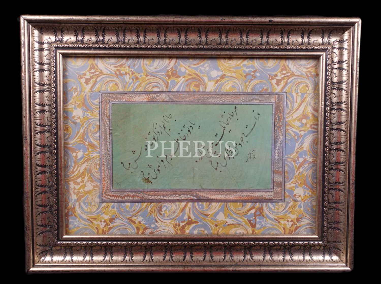 Farsça Ta'lik Mâil Kıt'a, Galib ketebeli, ebrulu ve çerçeveli, yazı: 11x22 cm