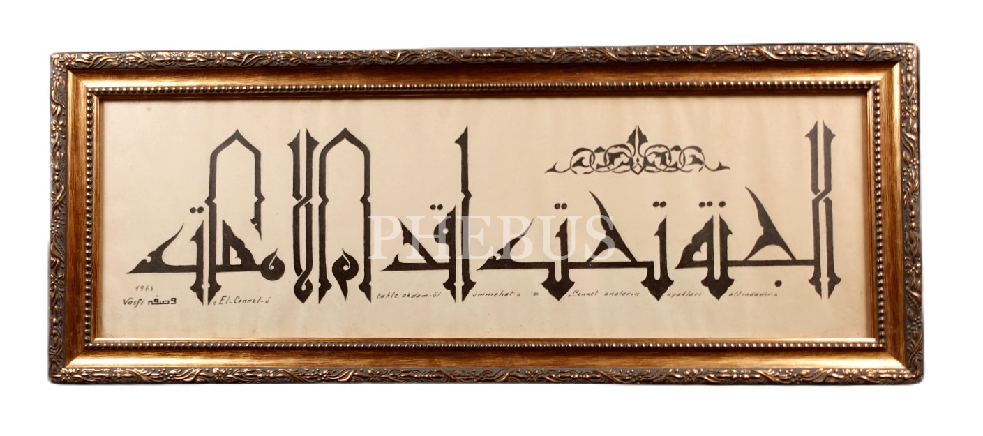 Kûfî Hadis-i Şerif: "Cennet anaların ayakları altındadır", Vasfi ketebeli ve 1968 tarihli, yazı: 18x58 cm