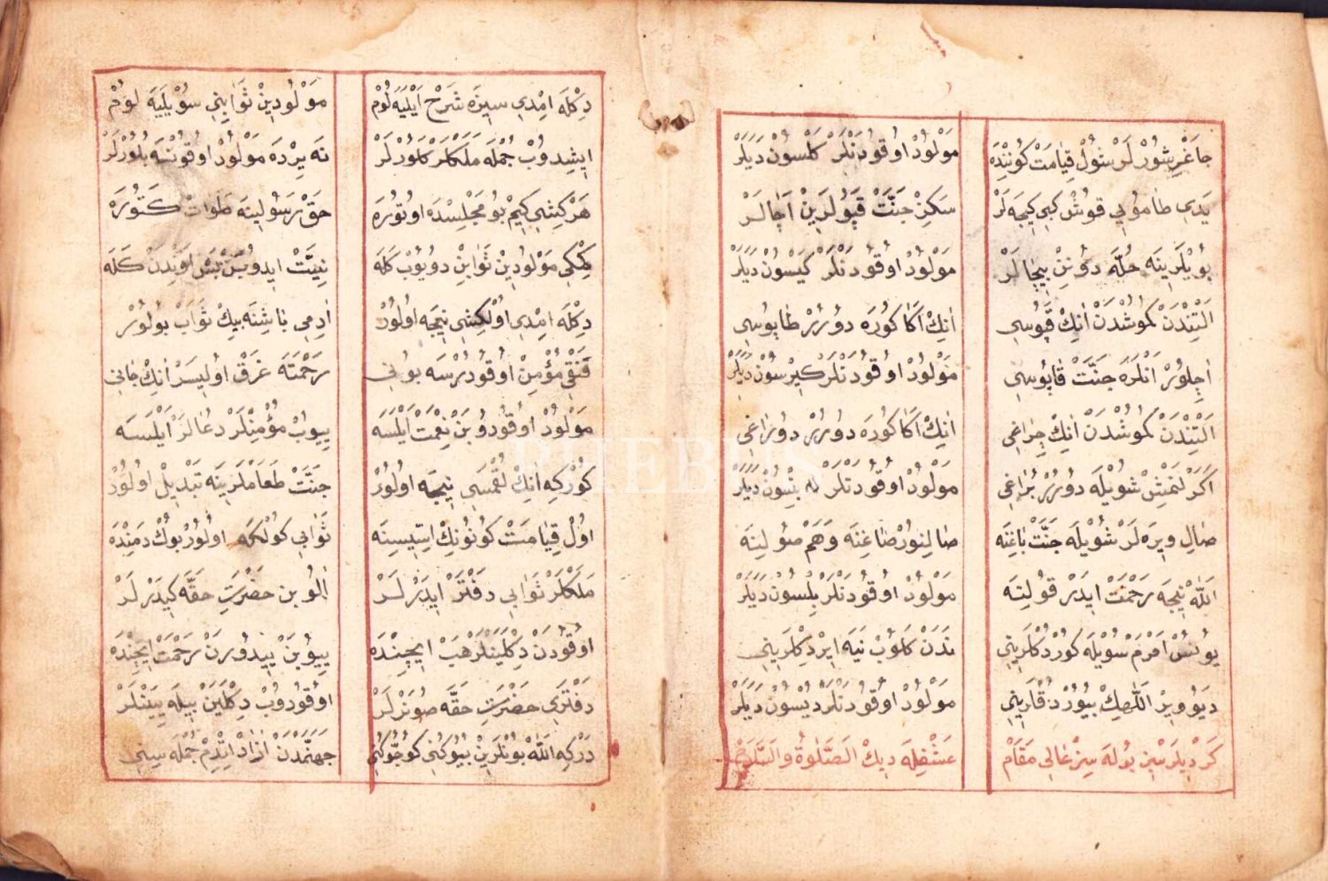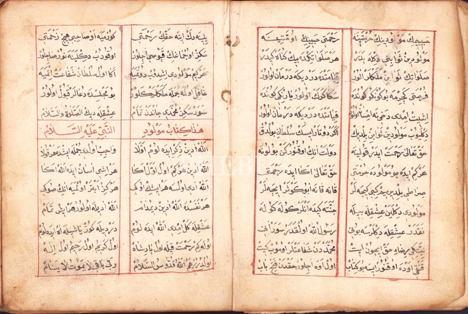 Osmanlıca El Yazması Kitâb-ı Mevlûd, Mustafa Efendi ketebeli ve 1266 tarihli, 59 s., 15x21 cm, cildi ve bazı sayfaları yıpranmış haliyle