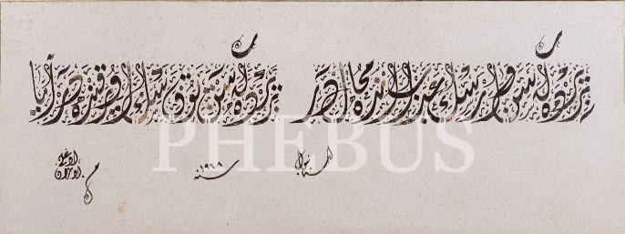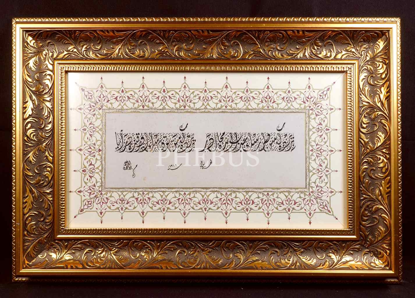 Celî Divanî Yazı: "Bir yerde sen varsın, azab anda muhaldir, Bir yerde sen yoksun, o yer kandedir âyâ [acaba]!", Ozanoğlu ketebeli ve 1968 tarihli, tezhipli, yazı: 13x34 cm