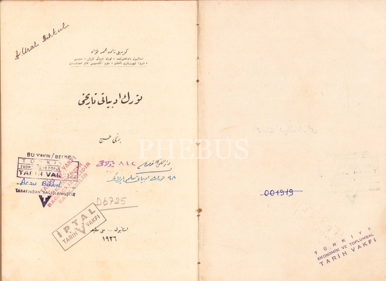 Mehmed Fuad'ın Osmanlıca "Türk Edebiyatı Tarihi" İlk Baskısı, Milli Matbaa 1926, 386 sayfa, cilt kenarları hafif yıpranmış haliyle, 17x24 cm